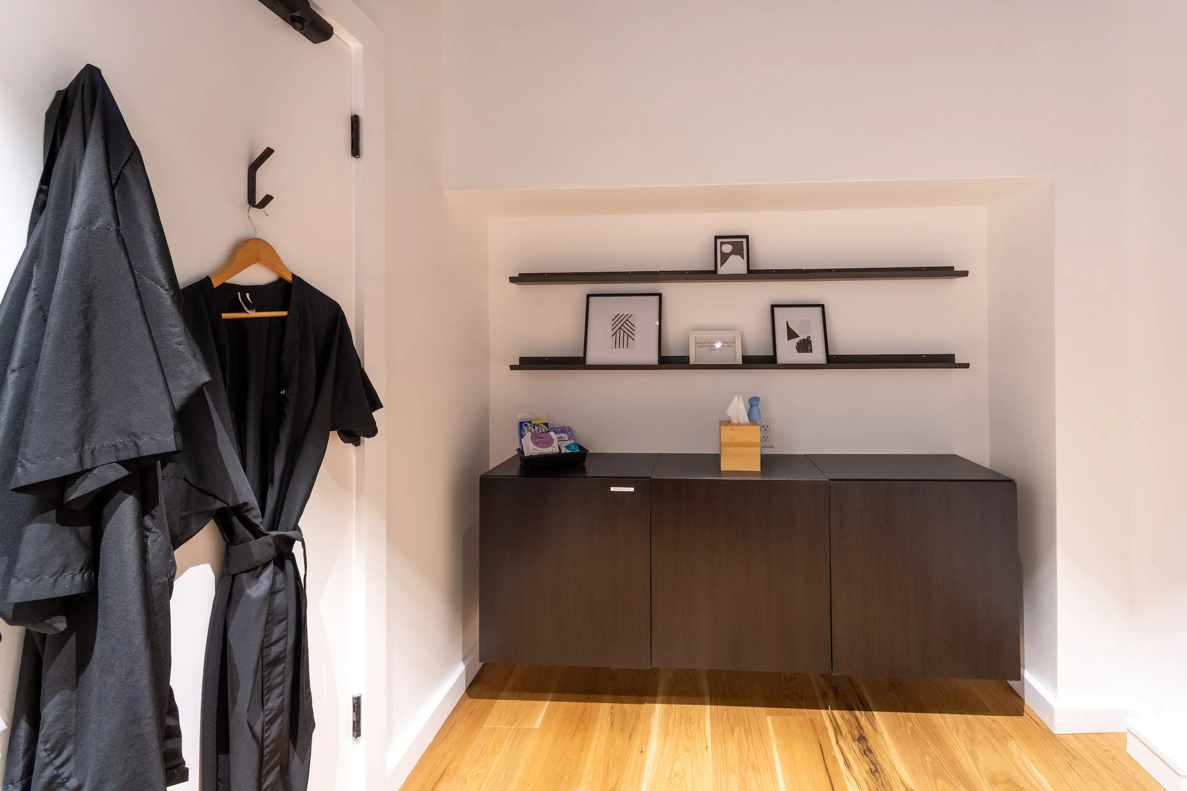 Warm wood tones, matte black finishes, and minimalist accents create a luxurious ambiance. The thoughtfully arranged layout ensures smooth transitions between reception, styling stations, and private areas. Industrial lighting and custom millwork enhance the contemporary aesthetic.